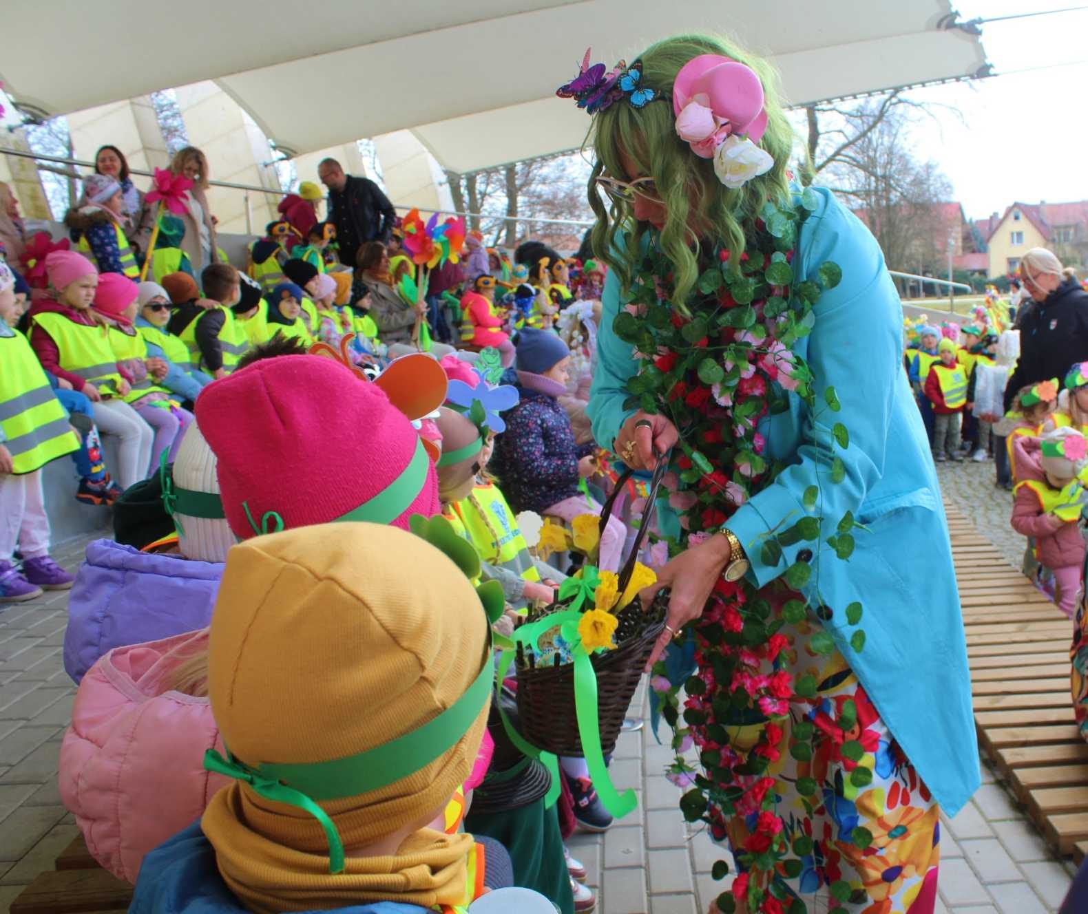 W wydarzeniu uczestniczyli przedstawiciele władz miasta, w tym burmistrz Romuald Antosik oraz zastępca burmistrza Joanna Misiak-Kędziora. Po krótkim wystąpieniu wspólnie z Panią Wiosną wręczyli najmłodszym słodkie upominki.