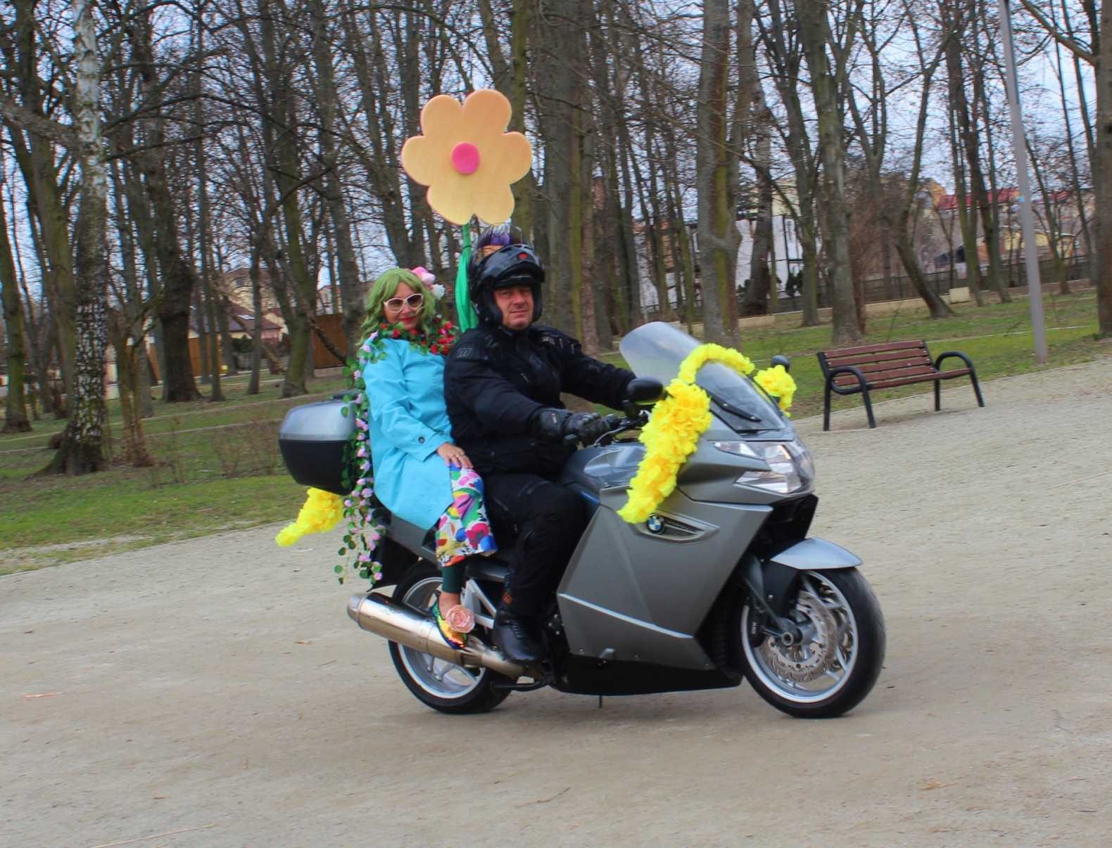 Nie zabrakło także elementu zaskoczenia. Pani Wiosna pojawiła się w parku w nietypowy sposób, wjeżdżając na skuterze, co wywołało entuzjazm i uśmiechy na twarzach dzieci.
