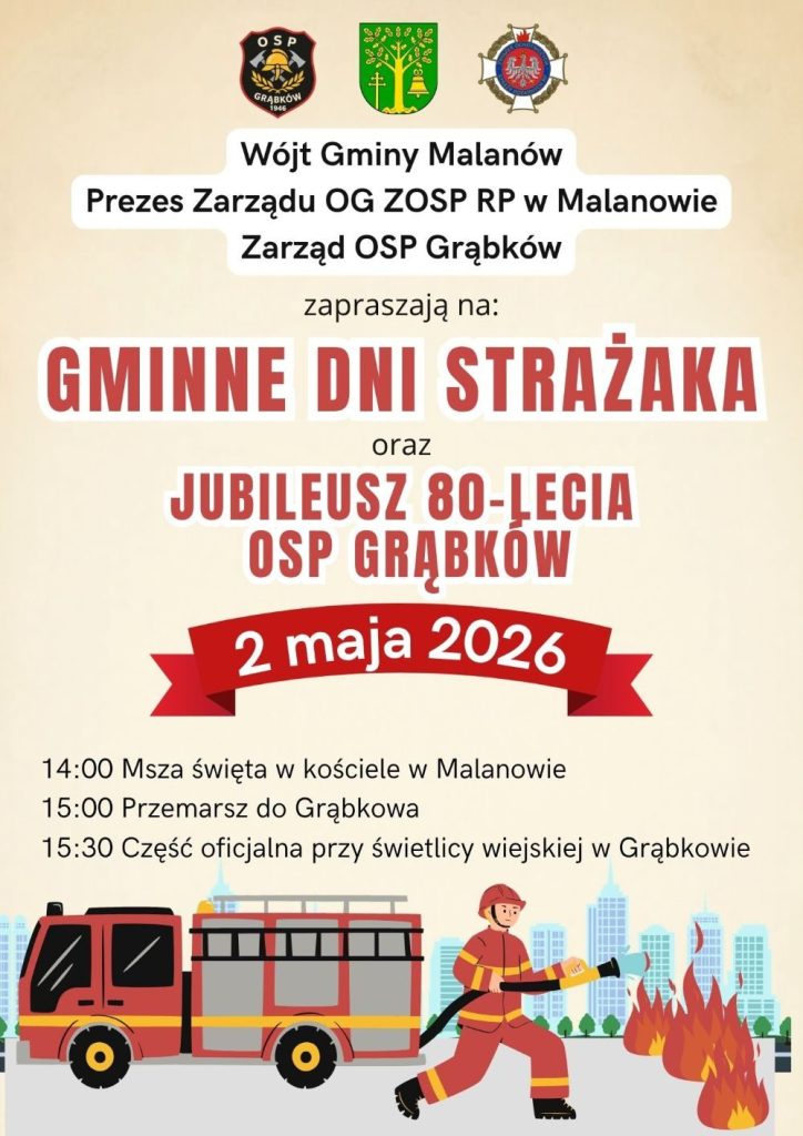 Gminne Dni Strażaka oraz Jubileusz 80-lecia OSP Grąbków rozpoczną się o godzinie 14.00 mszą świętą w kościele w Malanowie. Następnie delegacje przemaszerują do Grąbkowa, gdzie o godzinie 15.30 rozpocznie się oficjalna część przy świetlicy wiejskiej.