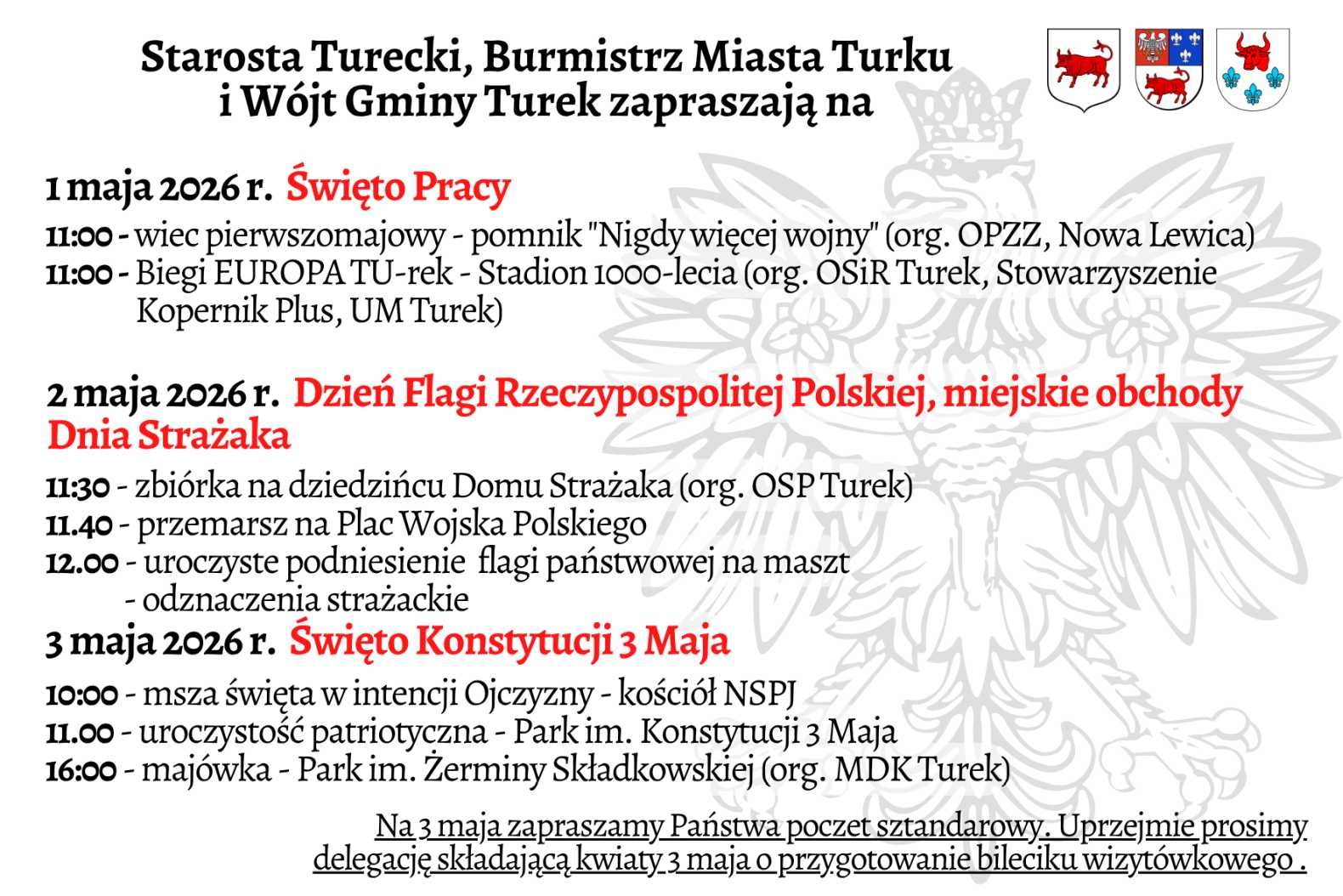 Mieszkańców miasta, gminy i powiatu tureckiego zapraszamy do wzięcia udziału w Dniu Flagi Rzeczpospolitej Polskiej oraz miejskie obchody Dnia Strażaka. O godzinie 11.30 będzie miała miejsce zbiórka przy OSP Turek, a następnie przemarsz delegacji na Plac Wojska Polskiego, gdzie odbędzie się dalsza część uroczystości.