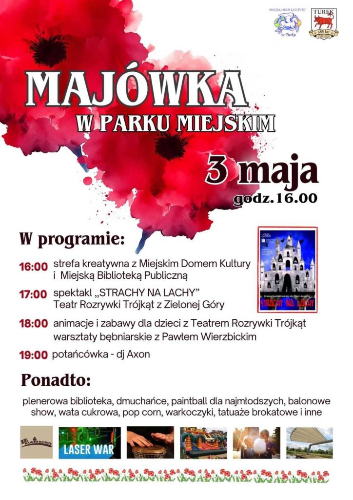 Tego samego dnia będzie miała miejsca Majówka w Parku Miejskim. Od godziny 16.00 mieszkańcy skorzystają ze strefy kreatywnej wraz z MDK Turek oraz Miejską Biblioteką Publiczną w Turku. O godzinie 17.00 zapraszamy na spektakl „Strachy na Lachy” w wykonaniu Teatru Rozrywki Trójkąt z Zielonej Góry. Od godziny 18.00 planowane są animacje i zabawy dla dzieci, warsztaty bębniarskie oraz potańcówka. Organizatorzy przygotowali też wiele innych atrakcji takich, jak plenerowa biblioteka, dmuchańcem balonowe show i wiele innych.