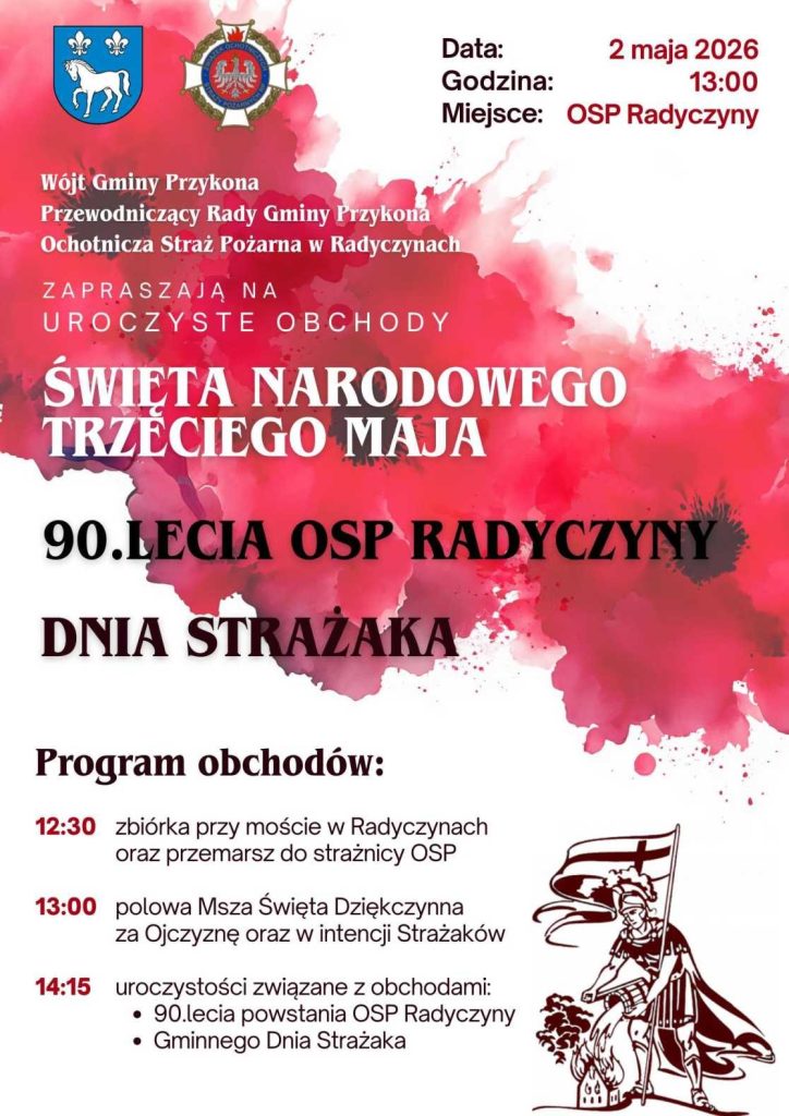 Wójt Gminy Przykona, Przewodniczący Rady Gminy Przykona i Ochotnicza Straż Pożarna w Radyczynach zapraszają na uroczyste obchody Święta Narodowego Trzeciego Maja podczas których obchodzone będzie 90.lecie OSP Radyczyny oraz Dzień Strażaka.