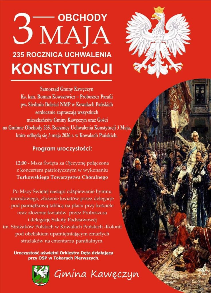 Samorząd Gminy Kawęczyn, ks.kan.Roman Kowszewicz- Proboszcz parafii pw.Siedmiu Bo.eści NMP w Kowalach pańskich zapraszają wszystkich mieszkańców gminy Kawęczyn praz gości na Gminne Obchody 235.Rocznicy Uchwalenia Konstytucji 3 Maja, które odbędą się w Kowalach Pańskich.